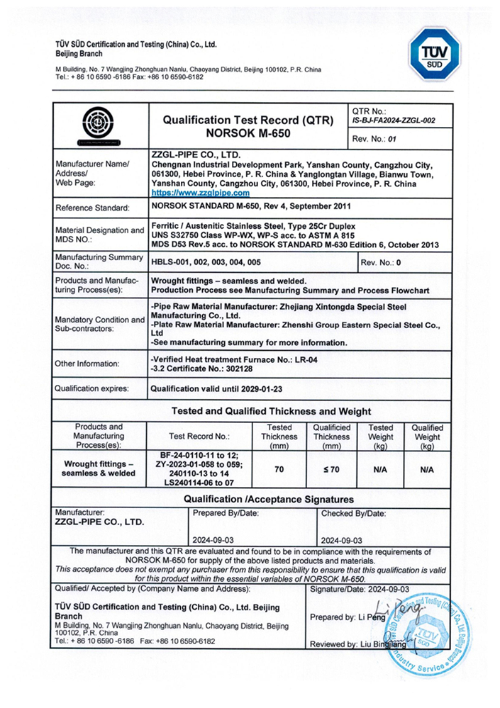公司已通过NORSOK M-650 ASTM A815 UNS S32750挪威国家石油标准认证。