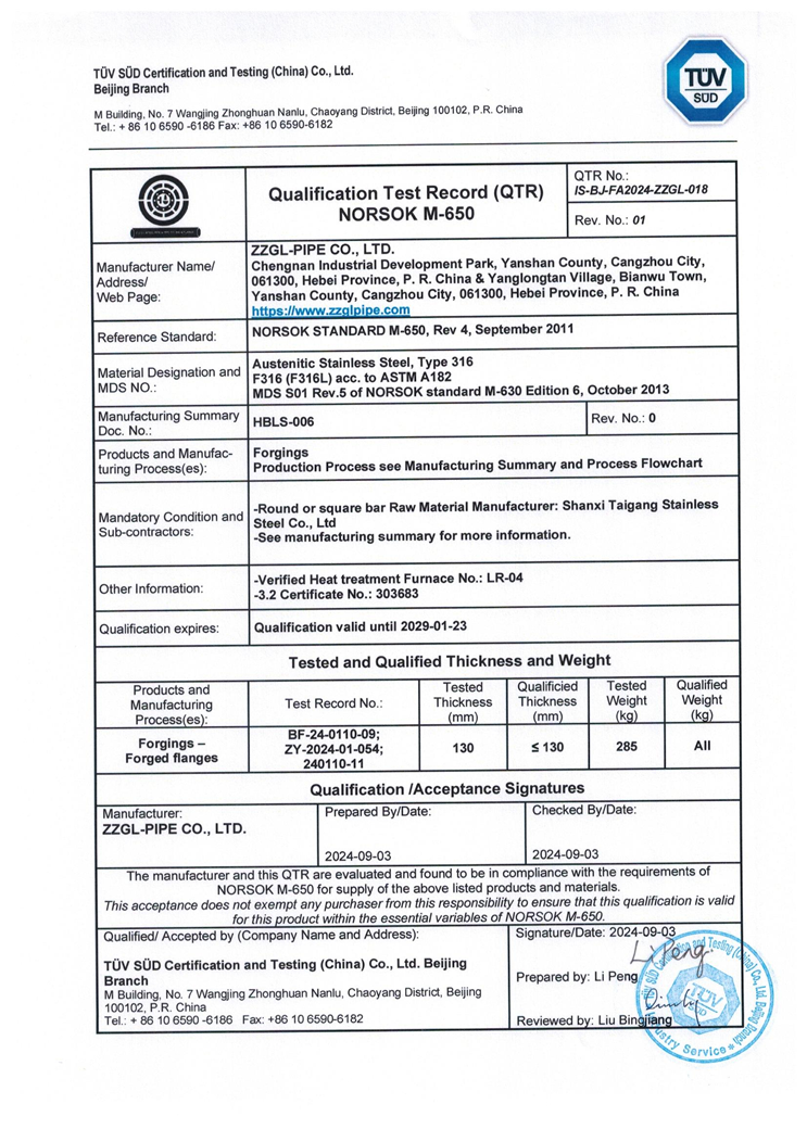 公司已取得NORSOK M-650 ASTM A182 F316(F316L)材质锻件的挪威国家石油标准认证。