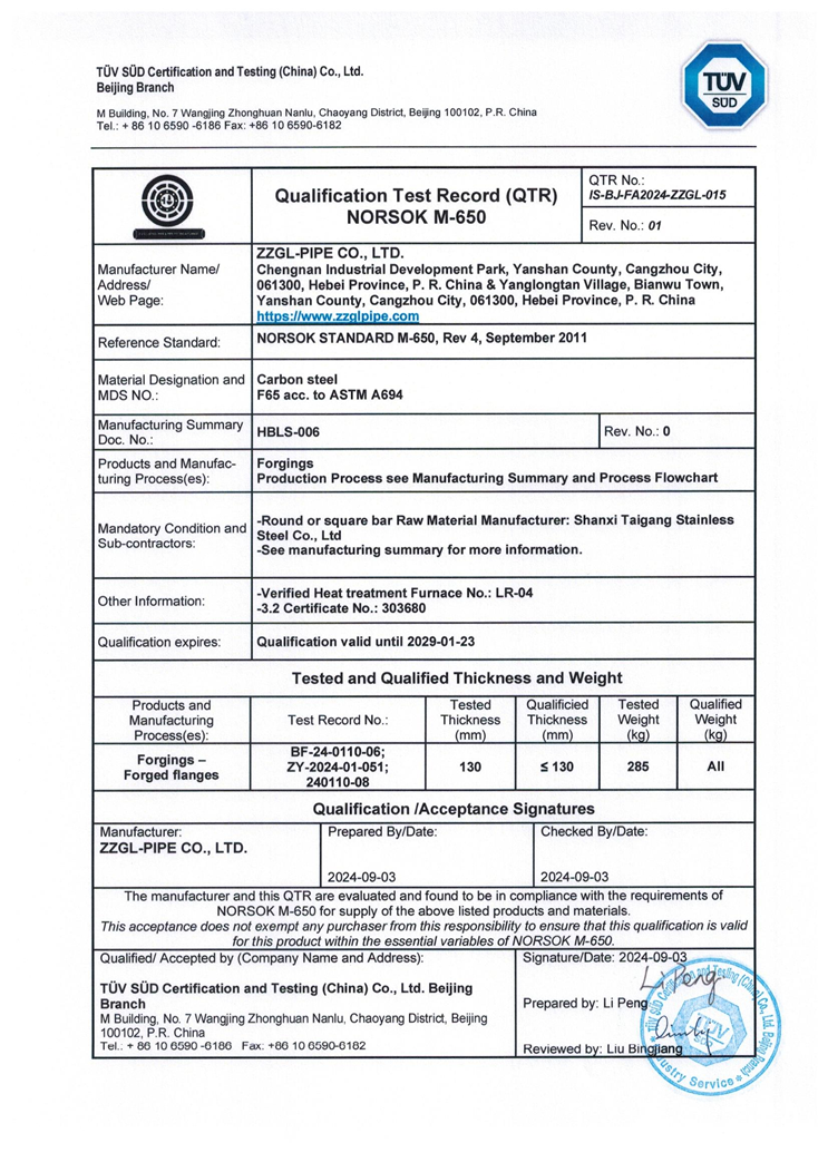 公司已取得:NORSOK M-650 ASTM A694 F65材质锻件的挪威国家石油标准认证。